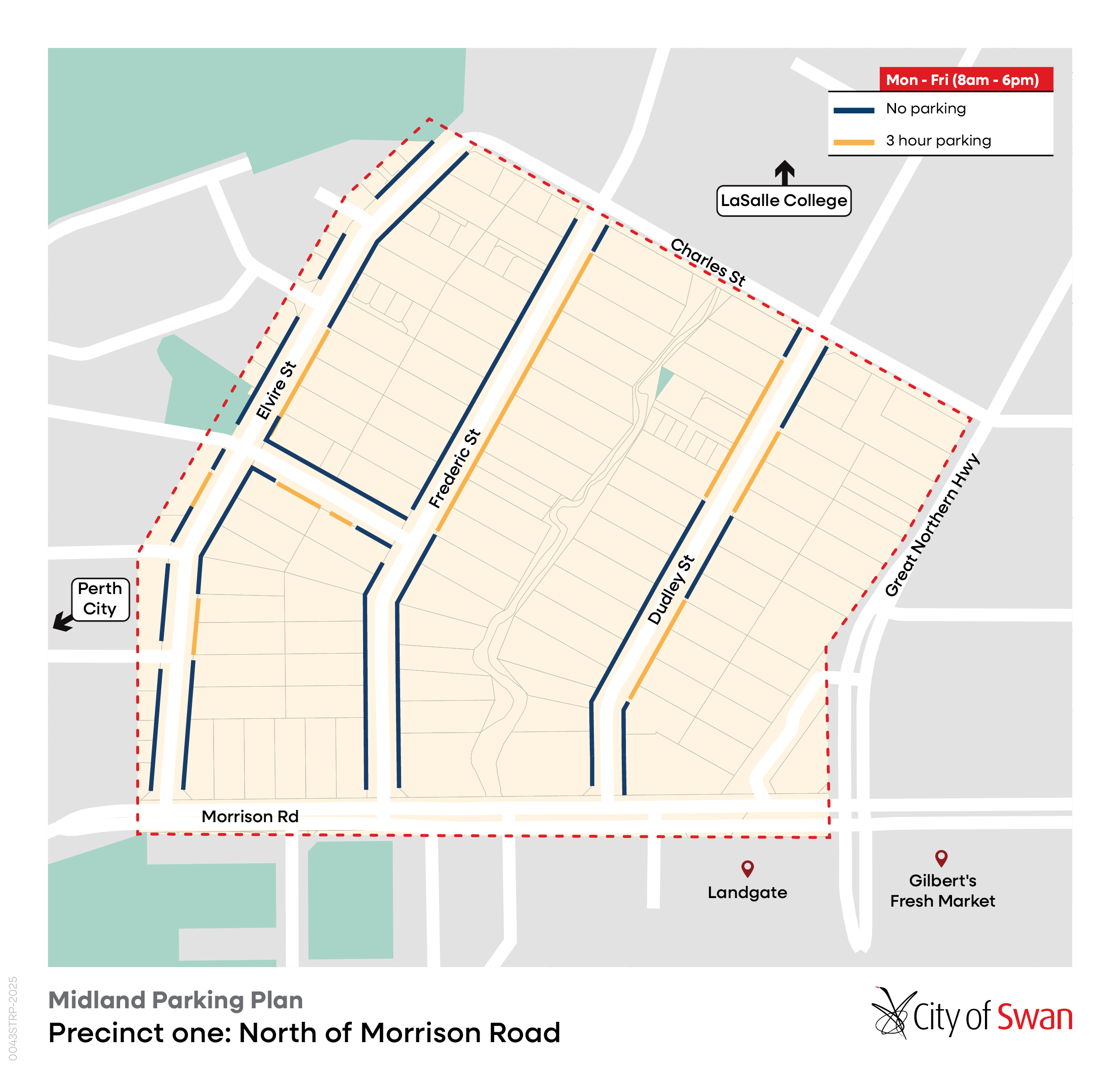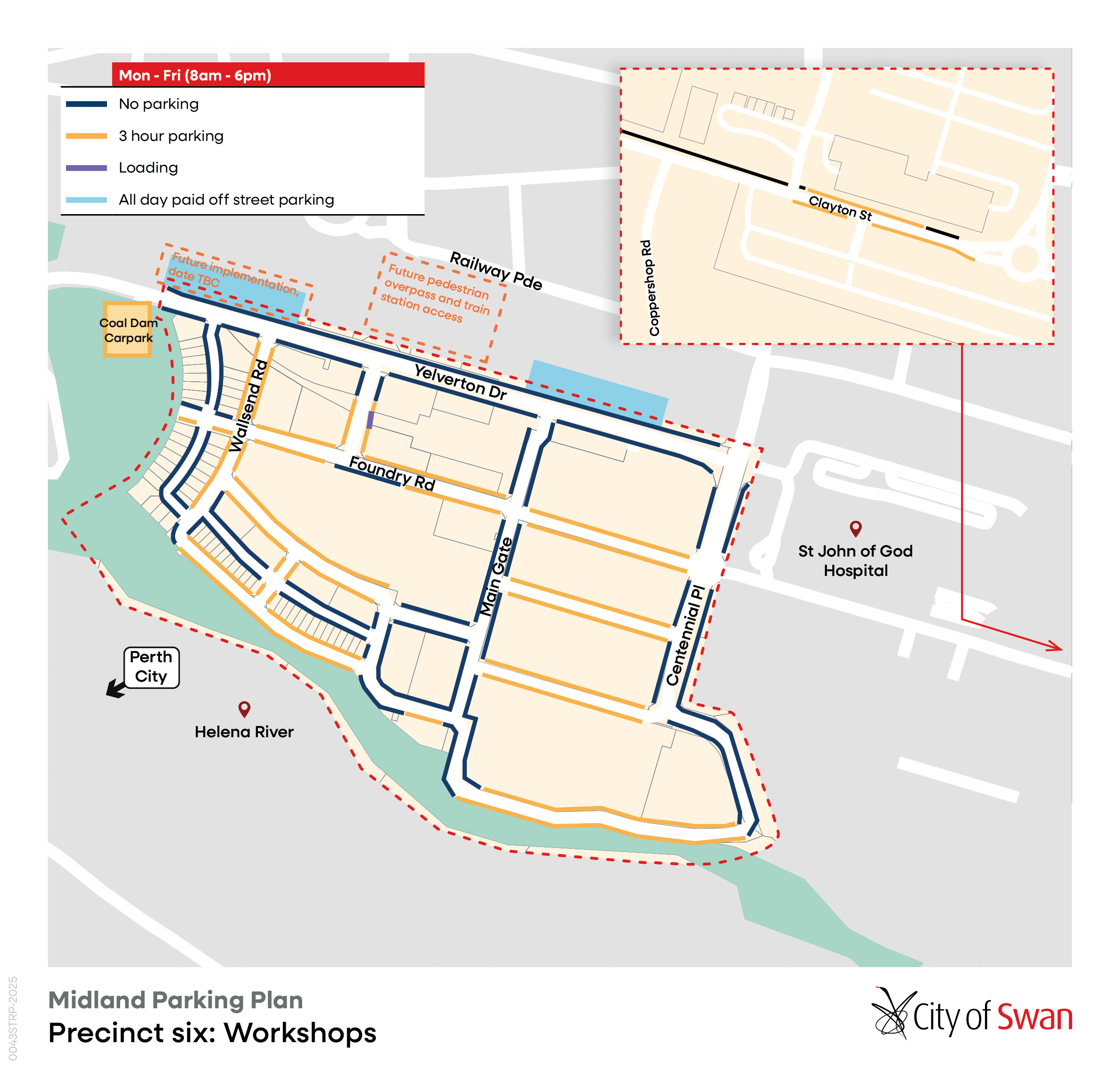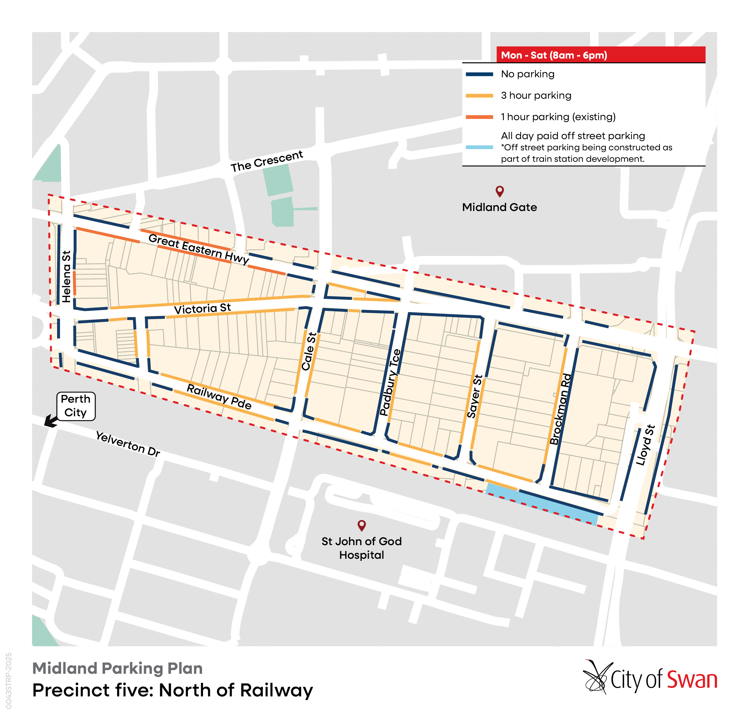 The City has prepared a draft Midland Parking Plan in response to community concerns and to address the growing pressures on existing on-street parking due to the amount of development occurring within the Midland CBD. The draft Midland Parking Plan has split the Midland CBD area into six precincts. With the imminent opening of the new train station, the City is starting with precincts 1, 5 and 6.
